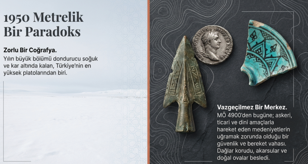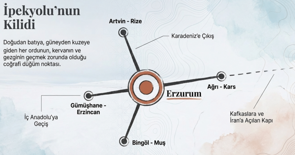 Doğu Anadolu Bölgesi’nin en büyük kenti Erzurum, sürekli yerleşim haricinde, insanlar tarih boyunca –kalkolitik, eski tunç, neolitik ve günümüze- doğudan batıya, güneyden kuzeye farklı amaçlarla- ticari, askeri, dini, fetih vb.– hareket ederlerken uğramak zorunda oldukları bir kavşak kenttir.