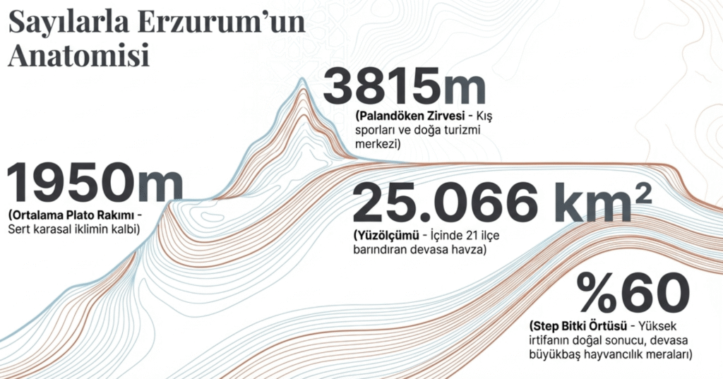 Palandöken dağları ile çevrili, Türkiye’nin en yüksek yerleşim yerlerinden Erzurum, rakımı 1950 m olan bir platoda yer almaktadır. Kent ve çevresinde sert karasal iklim özelliği- kışları uzun, soğuk ve kar yağışlı, yazları, kısa, sıcak ve kurak– hüküm sürmektedir.