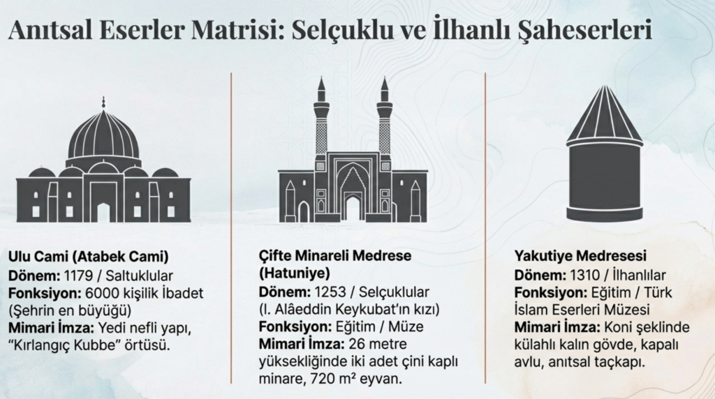Selçuklu döneminin en güzel mimari örneklerinden kabul edilen Üç Kümbetler’in planı ve süslemelerindeki farklılıklar geleneksel Türk mimari ve süsleme sanatının dışına çıkılan bir örnektir.