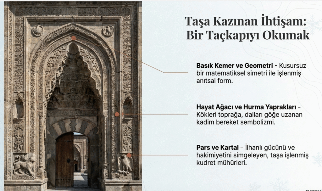Kapının yan nişlerinde hurma yaprakları, hayat ağacı, pars, kartal desenleri ve Yakup Bey’in amblemi bulunmaktadır.