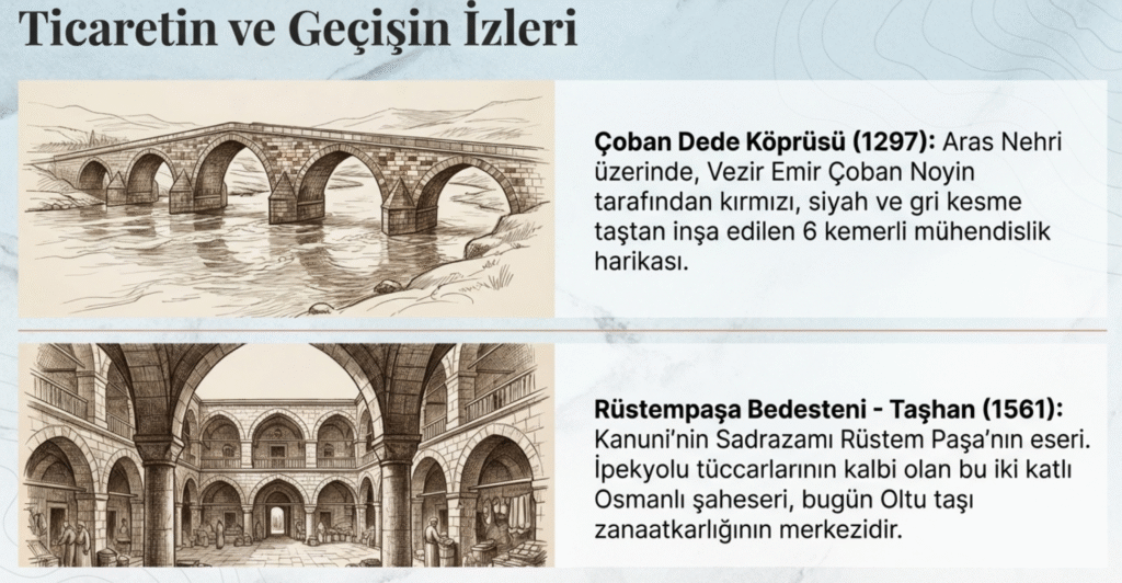 Ayrıca Aras Nehri üzerinde, Selçuklu ve İlhanlı mimari tarzında, kırmızı, siyah ve gri kesme taştan, 1297-1298 yılları arasında Veziri Salduzlu Emir Çoban Noyin tarafından inşa ettirilen ve zamanla onarılan ayakta kalan 6 kemer gözüyle görenleri büyüleyen Çoban- Çobandede Köprüsü, Hasankale’de İlhanlı Hasan Bey tarafından sarp kayalara, iç ve dış kale şeklinde, kesme taştan l339 yılında yaptırılan 15. yy. da Kanuni tarafından onarılırken bir de mescit eklenen, IV. Murat kasrıyla daha dikkat çekici hale getirilen Hasankale, Hasankale Ilıcası ve Soğukçermik, Ilıca ve diğer kaplıcalar, İspir Rafting merkezleri. 2200 m-3150 m yükseklikteki özellikle Büyük ve Küçük Ejder kayak pistleriyle, Palandöken -3815m kış sporları merkezi gezip görülecek yerlerin başında gelmektedir.