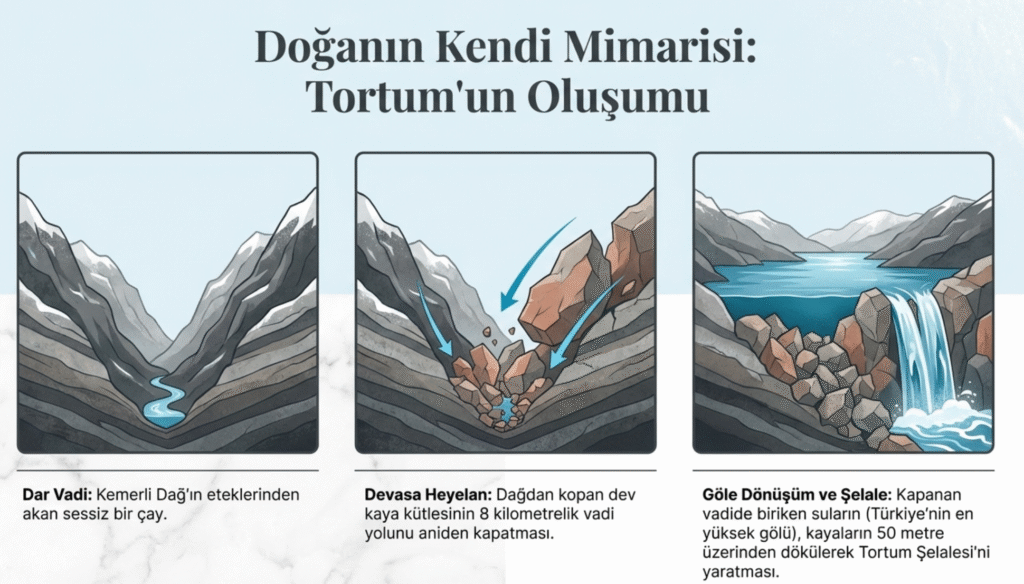 Bölgede meydana gelen heyelandan sonra Kemerli Dağ’dan kopan büyük bir kaya kütlesi dar ve dik vadiden akan çayın yaklaşık sekiz kilometrelik kısmını kapatarak Türkiye’nin en yüksek gölünün oluşmasını sağlamıştır. Ayrıca gölü besleyen akarsular kayaların yaklaşık 50 metre üzerinden akarak göldeki şelaleyi meydana getirmişlerdir.