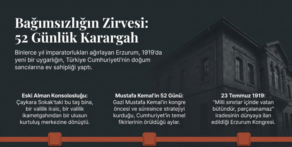 Kent, Cumhuriyet’in temellerinin atıldığı çalışmalara, paha biçilmez kararların alınıp onaylanması, ve 23 Temmuz 1919 Erzurum Kongresi’ne tanıklık etmiştir.