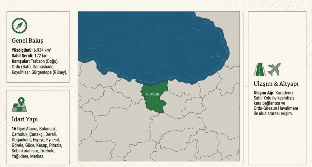 Giresun’a ülkenin her yerinden Karadeniz sahil yolu takip edilerek kolaylıkla ulaşılabilir. Ayrıca Ordu- Giresun arasındaki havaalanıyla da kente ulaşmak mümkündür.