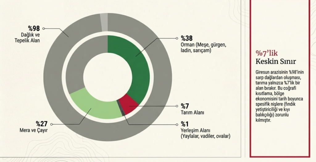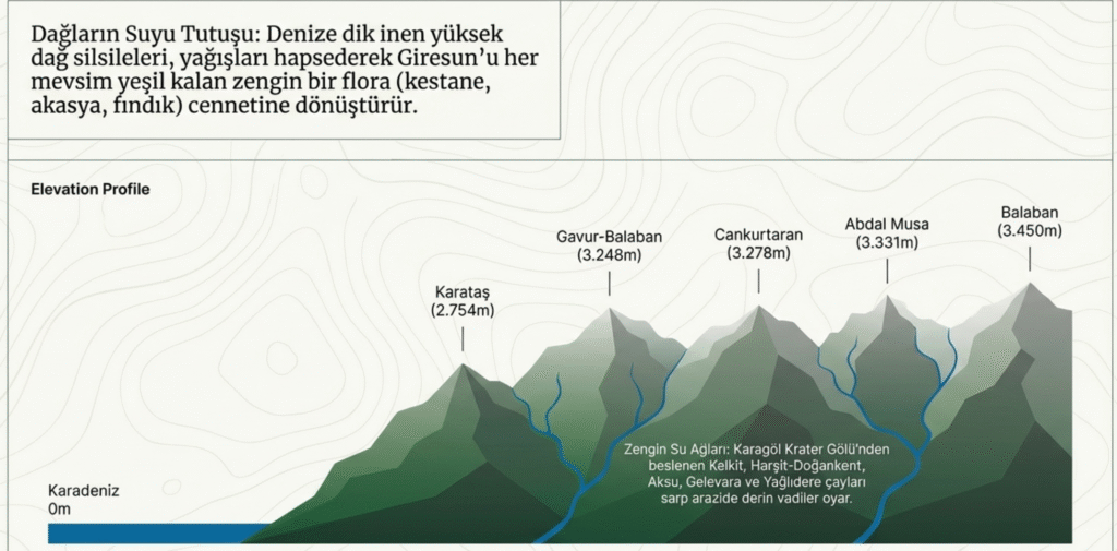 Yüksek ve denize dik % 98 dağ ve tepeler– 2754 m Karataş, 3038 m Kırkızlar, 3044 m Küçük Kor, 3278 mCankurtaran, 3040 m Kırklar, 3331 m Abdal Musa, 2440 m Gök, 2313mYörücek Tepeleri, 3450 m Balaban, 3038 m Karagöl, 2701 m Erimez, Karagöl, Giresun, Gümüşhane, Canik, 3248 m Gavur- Balaban- 2030 m Çal dağları- ve denizle çevrili bir yerleşim yeri olan Giresun, ikliminin ılıman olması, bol yağış alması, ürün yetiştirmeye elverişli toprağı ile her mevsim yemyeşil ve bitki örtüsü bakımından zengin bir ildir.