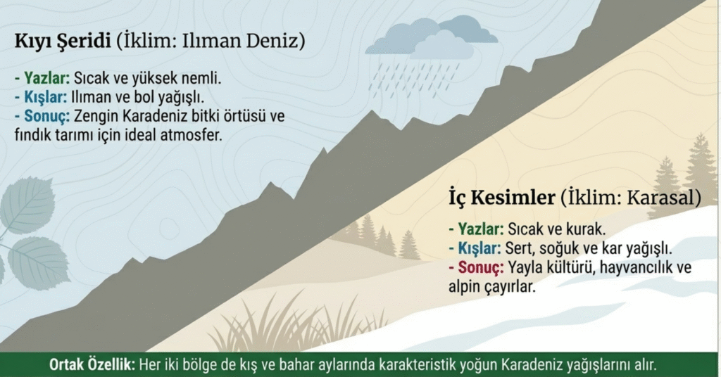 Karadeniz’e 122 km kıyısı olan Giresun’da ılıman deniz iklimi yanında çevresinde ve iç kesimlerinde de karasal iklim özellikleri de hissedilmektedir.