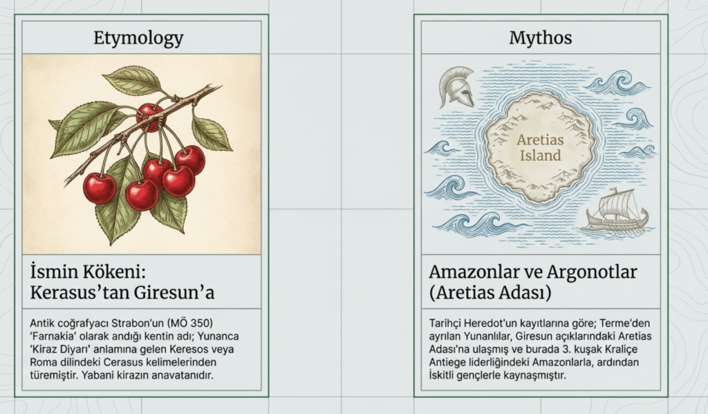 Antik dünyanın ünlü coğrafyacısı Strabon’un MÖ 350 yılında Farmakia dediği Giresun adının Yunanca, Keresos- Kiraz Diyarı, Roma dilinde Cerasus sözcüklerinden ya da Romalı yönetici Arrien Farnakia’nın eski adı olduğu varsayılan Kerasus’dan geldiği de tahmini görüşler arasındadır.