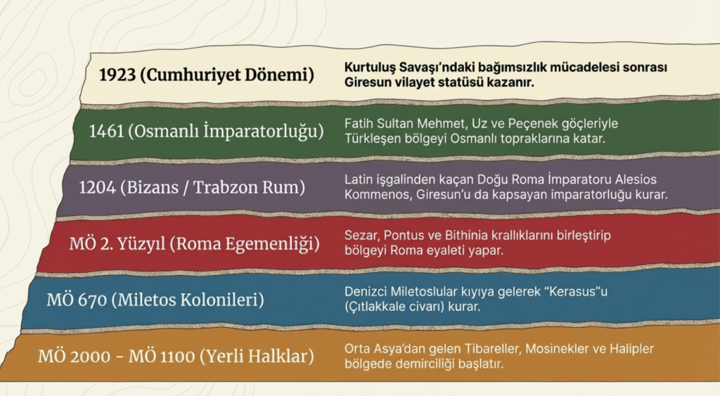 Giresun’da uzun süreli var olan Anadolu uygarlıklarından; MÖ 2000 yerli halklar, MÖ 700 Milet, İskit- Saka ve Kimmer, MÖ 6. yy. Med, MÖ 546- MÖ 323 Pers, MÖ 332 -MÖ 323 İskender, Helen ve Makedon MÖ 323-MÖ 301 Kapadokya Krallığı, MÖ 301-66 Pontos, MÖ 2. yy. Kerasus-Farnakia- Roma döneminde Sezar, Pontus ile Bithinia krallıklarını birleştirerek bölgeyi bir Roma eyaleti yapmıştır.