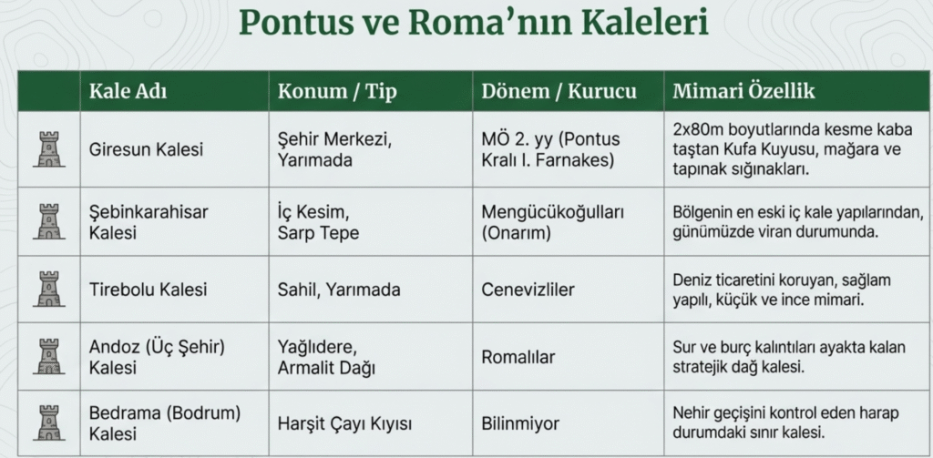 Ayrıca Giresun çevresinde, ilk yapım tarihi bilinmeyen ancak Mengücükoğulları zamanında onarılan, halen viran durumdaki Şebinkarahisar Kalesi, yarımada üzerinde, Cenevizliler zamanında onarılan, sağlam yapılı olduğu görülen küçük ve ince yapısıyla dikkat çeken Tirebolu Kalesi, Harşit Çayı kıyısında, harap durumda ama kale olduğu fark edilebilen bir Bedrama- Bodrum- Kalesi, Yağlıdere Çayı üzerinde, Armalit Dağı eteğinde, Romalılar döneminde yapıldığı düşünülen, sur ve burçların bir bölümü halen görülebilen, Üç Şehir anlamındaki Tirebolu- Andoz Kalesi bölgenin ayakta kalan tarihi kaleleridir.