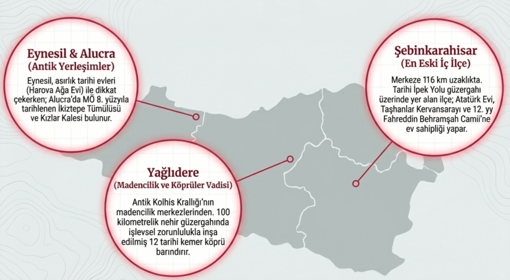 Ayrıca Giresun’un ilçelerinden son derece güzel kumsalları, Saint Jean Kalesi, Çarşı, Yeniköy Cami, hamam, Bedrama Kalesi ve Rum taş evleriyle Miletoslular tarafından kurulan, yüzyıllık üç katlı ahşap evlerin özgün mimarisiyle göz dolduran, 1800 yılında kurulan Taşkışlası bugünün Ticaret Lisesi, sokakları çeşmelerle çevrili, Ericek, Harova Ağanın evi tarihi evleri ve Sınır Köprüleriyle tanınan Eynesil, Kamışlı Kilisesi, Sivritepe, Gelinkaya yakınındaki yığma tepeden oluşan MÖ 8. yy. İkiztepe Tümülüsü ve Ören yeri, Kızlar Kalesi, Hayran Kaplıcası ile Alucra, Kolhis Krallığı’nın bir kısmını oluşturan ve dünyadaki ilk madencilik yerlerinden biri, mum, bal ve kerestenin çoğunlukla taşındığı ticaret yolları üzerinde, yaylaları, türbe ve tekkeleriyle Yağlıdere İlçesi, Yağlıdere Vadisi’nde aynı adlı çayda 100 km’de işlevselliğinden dolayı zamanında 12 kemer köprü yapılmıştır.