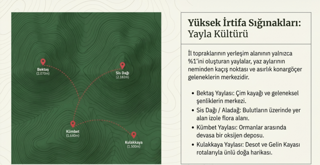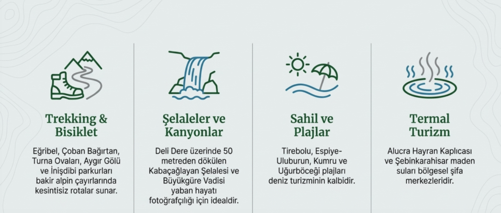 1450 m Paşakonağı Yaylası, Sis Dağı Yaylası– 2182 m Aladağ- 51 km uzaklıktaki Gölyanı Yaylası ile yine içinde pek çok yayla barındıran Dereli- Karagöl, içinde pek çok treking için uygun alanlar- Eğribel- Çoban Bağırtan, Turna Ovaları, Turna Ovası-Kümbet- Kümbet, Eğribel- Avşar Obası- Sağrak Gölü, Kırklar Tepesi–3107 m Karagöl Tepesi’de Aygır Gölü- Elmalı, İn Boynu, Bozat Obaları- parkurları ve Baybağan Yaylası, Deli Dere üzerindeki Deli Deresi ve dere üzerinde, 50 metreden akan Kabaçağlayan Şelalesi, Bulancak-Pazarsuyu, Bozak- Kovanlık, Büyükgüre Vadisi, Aymaç Çayırı, Çukurköy Manar, Espiriye- Çırıkkapı, Aluca, Desput Suyu, Bağırsak Gölü, Akçalı-Kök ev 3040m Kırklar Tepesi- Camlı, Dereli– 2600 m’ de Sağrak, Kazan Gölleri, İnişdibi, Çaldağı, Şebinkarahisar Maden Suları, bölgeye gelmek için diğer nedenler de tamamı doğanın, ormanların, yaylaların içinde akarsuların, derelerin – Aksu, Batlama, Gelevara, Harşıt- Doğankent, Yağlıdere, Pazarsuyu dereleri- bölge ve kente zenginlik katan ilin vadileri, yaylaları, sokaklarını da içine alan treking, fotoğraf ve bisiklet parkurlarının yanında kentin sahillerini süsleyip son yıllarda gittikçe uzayan ve sıcak geçen yaz aylarının vazgeçilmezi plajlarının yanında merkezde-Belediye, Kumru, Uğurböceği, Espiye- Uluburun, Tirebolu- Tirebolu Plajı, bilinen başlıca plajları olarak bölgenin deniz turizmi açısından önemli yerlerdir.