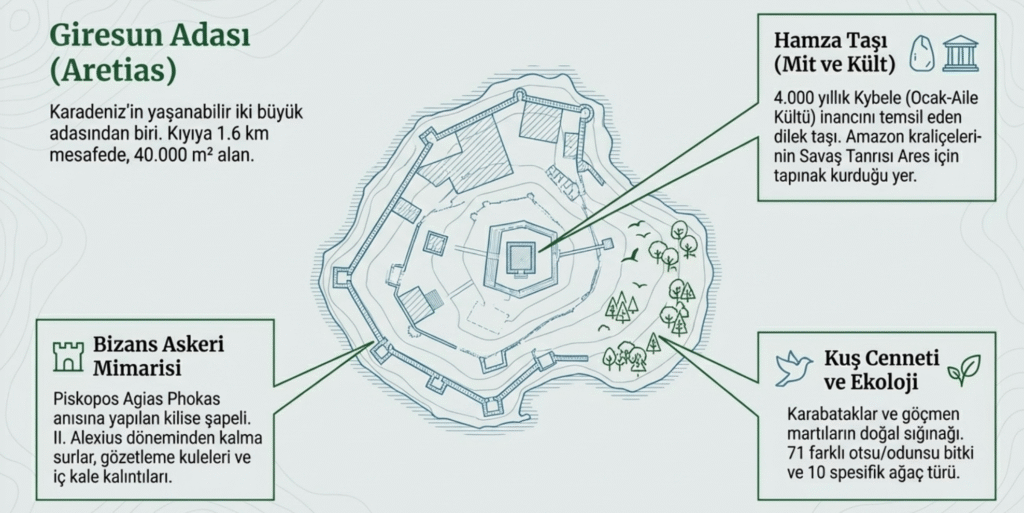 Karadeniz’deki iki büyük adadan biri, Giresun- Gedikkaya’dan kopan bir parçanın, 1.6 km uzakta durmasıyla oluşan, 40 bin m2 alanıyla çok sayıda efsaneye konu olan ve çeşitli adlarla –ilk çağda, Aretias, Areionesos ve Roma’da Nesos, Area, Areos, Chalceritis– günümüze gelen Giresun Adası’nda Amazon kraliçeleri savaş tanrısı Ares adına tapınak inşa ederken çok sonraları Hıristiyanlar Sinop Piskoposu Agias Phokas adına manastır yapmışlardır.