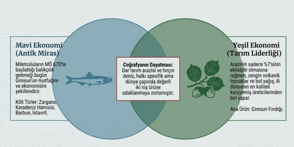 Giresun ve çevresindeki ilçelerde hem miktar hem de lezzet açısından vazgeçilmez balıklar- zargana, hamsi, barbun, istavrit- bunun yanında ilin en önemli geçim kaynağı fındık olarak sıralanmaktadırlar.