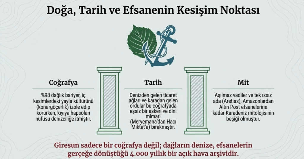 Bir dönem Ceneviz ve Venediklilerin de yaşadığı Giresun Adası’nda Altın Post ve Argonautların efsanesinin geçtiğine inanılırken yerleşim yerindeki II. Alexius zamanında yapılan –sur, kule, manastır-iç kale, pişmiş topraktan fıçı ve bazı yapı temel kalıntıları- 4 bin yıllık, Kybele– Ocak-Aile Kültü’nü temsil eden Hamza Taşı ve Dilek Taşı dikkat çekmektedir.