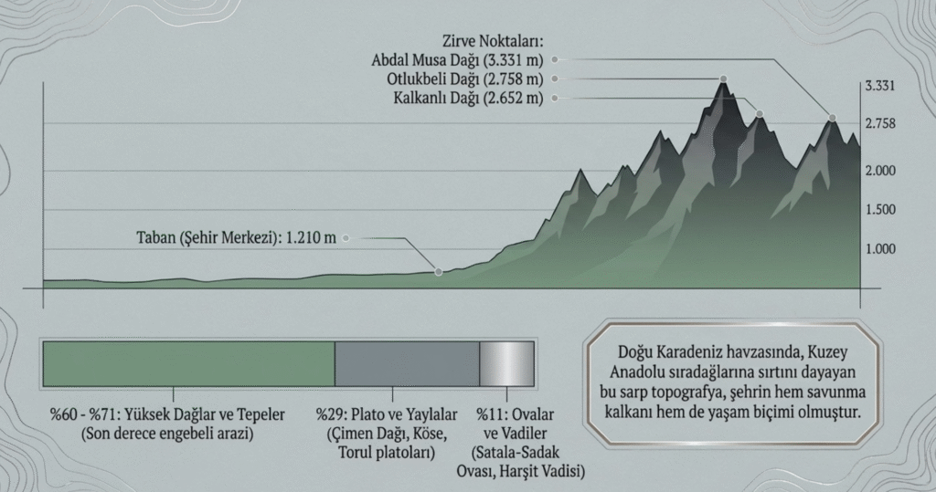 Denizden 1210 m yükseklikte, % 60- 71 yüksek dağ ve tepelerle– Zigana- Kalkanlı- 2652 m Kalkanlı- Yayla Tepe, Soğanlı, Kelkit, Gümüşhane, Kop ve 2758 m Otlukbeli Dağı- Hatabi, 3331 m Abdal Musa, – 2572 m Gümüşhane Dağı- Alitaşı ve 2507 m Elmalı tepeleri ve Pöske Vauk, Köse dağlarıyla– çevrili Gümüşhane, ilkbahar yağmurları ve doğal su kaynakları- Harçit, Kelkit çayları, Soğanlı, Şarak, Çakır, Balıklı, Yıldız, Aygır gölleri– ile beslenmektedir.