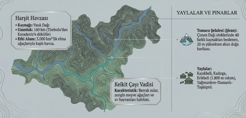 Gümüşhane’nin doğusunda, geçtikleri vadilere- Kova Beli, Orta Harşit, Kürtün -ve yaylalara- Dulağa, Kadırga, köylere- Gümüştuğ, Esenyurt, Doğankent- yaşam kaynağı olan pek çok pınar, dere –Sifon, Gümüşhane, Avliyana, Mavragel, Keçi, Erikbeli, Haşara, Krom, Korum, İkisu, Süten, Çit, Fırtına – ile çayın kaynağı Vauk Dağı’ndan çıkıp Giresun- Tirebolu’dan Karadeniz’e dökülen Doğankent Çayı’da denilen 160 km. lik Harşit Çayı, 3000 km2’lik alan, elma ağaçlarıyla dikkat çeken Harşit Havzası’nı beslemektedir.