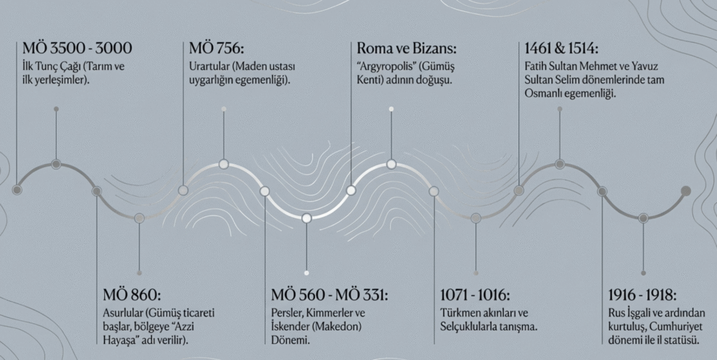MÖ 756 yıllarında maden işlemekte usta bir uygarlık olan Urartuların egemen olduğu Gümüşhane’de sırasıyla MÖ 560 Med, MÖ 550- MÖ 350 Pers, Kimmer, MÖ 480 Khalip- Khaledi-Haldiler, MÖ 400 İmparator II. Artakserkses, MÖ 334- MÖ 331 İskender, Helen, Makedon, Roma, Ermeni, MÖ 301 Pontus, MÖ 20 Roma, 395 Bizans tarafından yurt edinilmiştir.