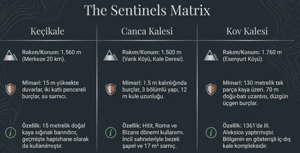 Kent merkezine 20 km uzaklıkta, denizden 1560 m yükseklikteki dik kayalarda, 78m x 27 m boyutlarında, 5 m-15 m yükseklikte duvarları olan kalenin iki girişi bulunmaktadır.