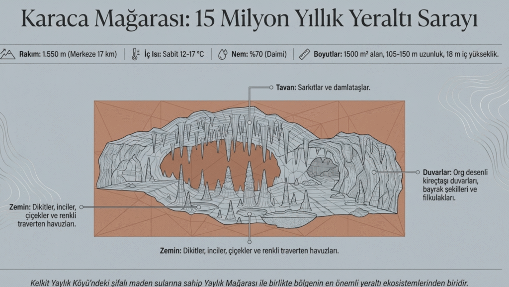 105 m- 150 m uzunluğunda, 18 m iç yüksekliği ve 1500 m2 alanı olan mağaranın içindeki karstik şekiller, kireçtaşları, sarkıt ve dikitleri, sütunları, damlataşları, mağara iğneleri, gülleri, incileri, çiçekleri, org desenli duvarları, bayrak şekilleri, filkulakları, renkli travertenleri, havuzları doğal ortamı ile son derece dikkat çekici bir yeraltı sarayına benzetilebilir.