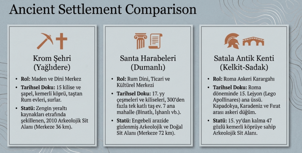 Gümüşhane’ye 36 km uzaklıkta, Yağlıdere Köyü’nde, zengin yeraltı kaynakları nedeniyle tarihin ilk yıllarından beri çok sayıda uygarlığa ev sahipliği yapan Krom Vadisi bulundurduğu tarihi değerlerden- 15 kilise ve şapel, kemerli köprü, taştan Rum eveleri, surlar, değirmen– dolayı 2010 yılında, Arkeolojik Sit Alanı ilan edilmiştir.