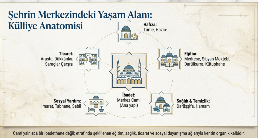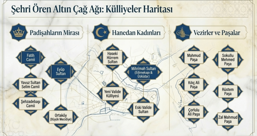 Haliç kıyısı Eyüp’te, 1453-1459 yılları arasında Fatih Sultan Mehmet tarafından Eyüp Sultan’ın mezarı yanına, dönemin Osmanlı mimari, teknik ve malzeme özelliklerine bağlı kalınarak yaptırılan cami, türbe, imaret ve çifte hamamdan oluşan her gün çok sayıda kişi tarafından ziyaret edilen çeşitli dönemlerde onarımlar geçiren, genişletilen, kentin en önemli İslam dini yapılardan biri olan Eyüp Sultan Cami ve Külliyesi, kentin en eski yerleşim yerlerinden Fatih’te, 1463-1471 yılında, Fatih Sultan Mehmet tarafından yaptırılan ve kentin ilk yüksek öğretim kurumlarından olan İstanbul Üniversitesi’nin temelini oluşturan medresesi, içinde el yazma 10 bin kitabı barındıran Süleymaniye Kütüphanesi, cami, medrese, darüşşifa, tabhane, imaret, sıbyan mektebi, kitaplık, hamam, saraçlar çarşısı ve çeşitli türbelerden oluşan ve değişik zamanlarda onarımlar da geçiren tipik Osmanlı mimarisini yansıtan Fatih Cami ve Külliyesi, Mahmudpaşa’da cami, türbe, hamam, medrese, sıbyan mektebi, mahkeme, çarşı ve imaretten oluşan Mahmud Paşa Cami ve Külliyesi, Edirnekapı’da, Kanuni Sultan Süleyman’ın kızı Mihrimah Sultan tarafından Mimar Sinan’a yaptırılan halen döneminin mimari dehasını ve özelliklerini yansıtan kentin en güzel yapılarından olan cami, medrese, sıbyan mektebi, hamam, türbe ve dükkanlardan oluşan, depremlerden zarar gördüğü için zaman zaman onarılan Mihrimah Sultan Camii ve Külliyesi, 1522 yılında Haliç’e hakim yüksek bir noktada yapımına Yavuz Sultan Selim tarafından başlatılan ve Kanuni Sultan Süleyman tarafından tamamlatılan cami, tabhane, imaret, sıbyan mektebi, hamam, türbe ve medreseden oluşan zamanla bazı kısımları yıkılan yanında, Yavuz Sultan Selim’in türbesi de bulunan Sultan Selim Cami ve Külliyesi ve Arap Cami, Aksaray’da, 1551 yılında, Haseki Hürrem Sultan tarafından Mimar Sinan’a yaptırılan cami, medrese, sıbyan mektebi, imaret, darüşşifa ve çeşmeden meydana gelen depremlerle zarar gördüğü için çeşitli defalar onarılan, dönemin mimarisini yansıtan, son derece güzel ve zarif bir yapı olan Haseki- Haseki Cami ve Külliyesi ve Valide Cami, Davutpaşa- Davutpaşa Cami ve Külliyesi ve Hekimoğlu Ali Paşa Cami ve Külliyesi Topkapı’da, Kara Ahmed Paşa Cami ve Külliyesi, Silivrikapı- İbrahim Paşa Cami ve Külliyesi, Cerrahpaşa- Cerrahpaşa Cami ve Külliyesi ve Koca Mustafa Paşa Cami ve Külliyesi, Fatih- Amcazade Hüseyin Paşa Cami ve Külliyesi, Hırka- ı Şerif, İskender Paşa ve Bali Paşa Camileri, Eyüp- Zal Mahmud Paşa Cami ve Külliyesi, Üsküdar- Mihrimah Sultan Cami ve Külliyesi, Yeni Valide Cami ve Külliyesi, Eski Valide Sultan Cami ve Külliyesi, Aziz Mahmud Hüdayi Cami ile Çinili Cami ve Külliyesi ile Ayazma Cami, Şemsipaşa’da, Şemsi Paşa Cami ve Külliyesi, Beylerbeyi- Beylerbeyi Cami ve Külliyesi, Şehzadebaşı- Şehzade Cami ve Külliyesi, Eminönü- Yeni Valide Cami ve Külliyesi ve Rüstem Paşa Cami, Sultanahmet- Sultan Ahmed Cami ve Külliyesi ve Sokullu Mehmed Paşa Cami ve Külliyesi, Bayezıd Kütüphanesi’nde, 240.500 basma ve 10.698 el yazması eserin yer aldığı Bayezıd Cami ve Külliyesi, Nuruosmaniye Kütüphanesi’nde 10.000 el yazması ve 6000 basma eserin olduğu Nuruosmaniye Cami ve Külliyesi, Laleli- Laleli Cami ve Külliyesi, Çarşıkapı- Merzifonlu Kara Mustafa Paşa Cami ve Külliyesi, Çemberlitaş- Atik Ali Paşa Cami ve Külliyesi, Divanyolu- Köprülü Mehmed Paşa Cami ve Külliyesi, Tophane- Kılıç Ali Paşa Cami ve Külliyesi ile Nusretiye Cami, Çarşıkapı- Çorlulu Ali Paşa Cami ve Külliyesi, Şehzadebaşı- Damad İbrahim Paşa Cami ve Külliyesi, Selimiye- Selimiye Cami, Beşiktaş- Hamidiye- Yıldız Cami, Ortaköy- Ortaköy-Büyük Mecidiye Cami, Şişli- Teşvikiye Cami, Emirgan- Emirgan Cami, Beyoğlu- Ağa Cami, Fındıklı- Cihangir Cami kentin Osmanlı döneminin çeşitli zamanlarının izlerini taşıyan ve gezilip görülmesi gereken önemli İslam dini yapılardır.