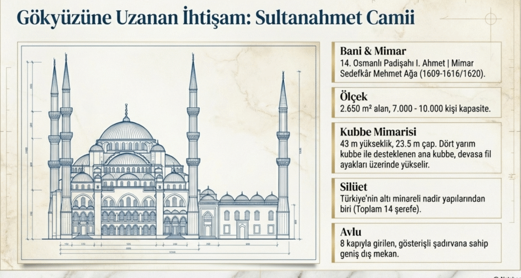 Sultanahmet- Atmeydanı’nda, Ayasofya Kilise- Müze- Cami’nin karşısına yer alan cami, 14. Osmanlı Padişahı Sultan I. Ahmet tarafından, 1609-1616-1620 yılları arasında medrese, darülkurra, sıbyan mektebi, türbe, arasta, dükkânlar, hamam, darüşşifa, imaret ve üç sebil ile birlikte Mimar Sedefkâr Mehmet Ağa’ya yaptırılan yapıdan günümüze sadece cami, medrese ve türbe kısımları kalmıştır.