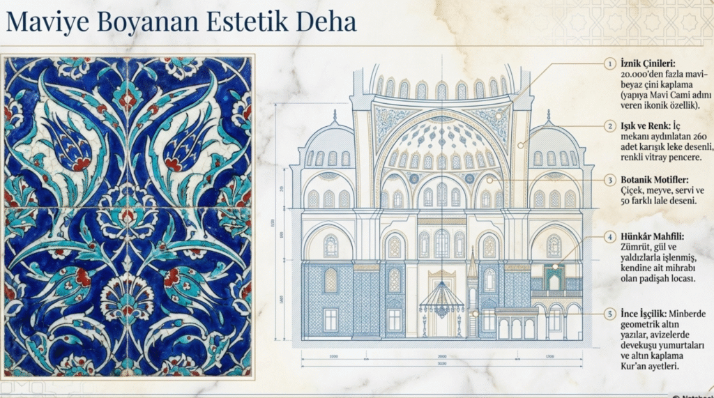 20 binden fazla mavi- beyaz İznik çinisi ile kaplı cami renginden dolayı Mavi Cami olarak da adlandırılmaktadır.