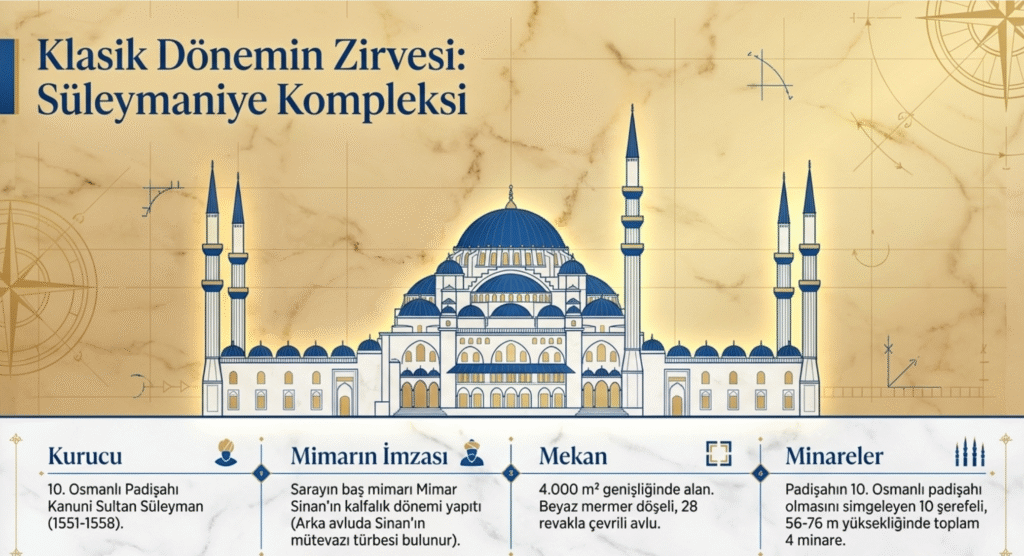Osmanlı’nın 10. padişahı Sultan Süleyman için avlunun dört köşesinde 56-76 m. yüksekliğinde toplam 10 şerefeli 4 minare bulunmaktadır.