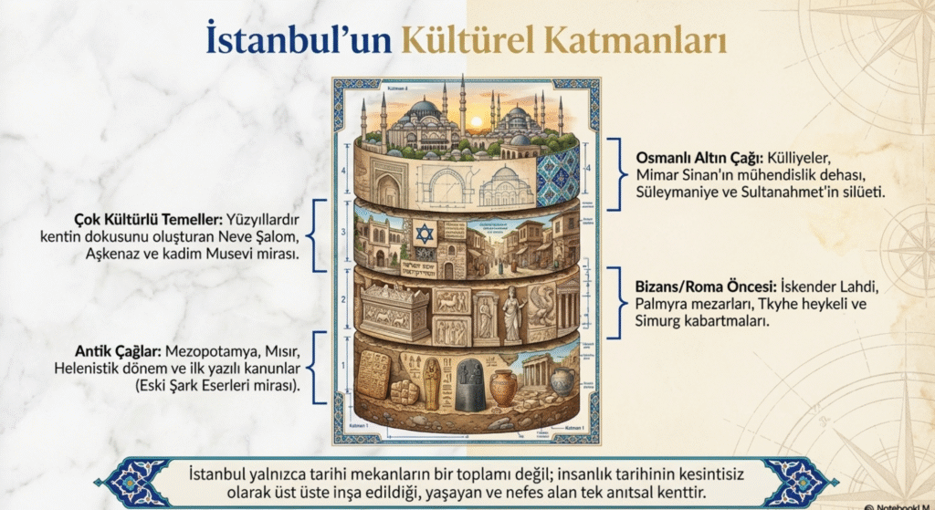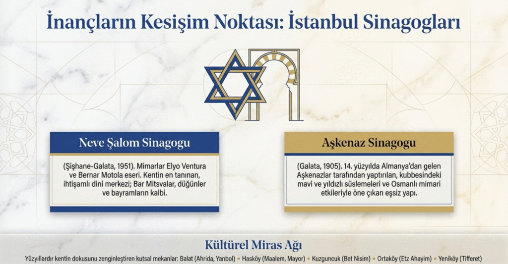 Ayrıca İstanbul’da Osmanlı’nın ilk dönemlerinden beri İspanya’dan gelen Yahudilerle sayıları artan ve yüzyıllar boyunca devam eden Musevi yurttaşların dönemlerinin mimari özelliklerini yansıtan dini yapıları sinagoglardan; Musevi nüfusun yoğunlukla yaşadığı yerlere yakın Şişhane, Galata arasında, 1951 yılında Mimarlar Elyo Ventura ile Bernar Motola’ya yaptırılan, ihtişamıyla en çok tanınan, düğünler, cenazeler, Bar Mitsvalar, Sünnet ve dini bayramlarda en çok kullanılan Neve Şalom Sinagogu ile Galata-Yüksek Kaldırım’da, 1905 yılında 14. yy. da Almanya’dan gelerek bu bölgeye yerleşen Aşkenazlar tarafından yaptırılan ve dönemin Osmanlı mimari özellikleri de yansıtan, kubbesindeki mavi ve yıldızlı süslemeleriyle dikkat çeken Aşkenaz Sinagogu ve Balat-Ahrida, İstipol, Yanbol, Galata- İtalyan, Tofre Begadim, Hasköy- Esgher, Karait, Kula, Maalem, Mayor, Parmakkapı, Sinyora, Haydarpaşa- Hemdat İsrael, Kuzguncuk- Bet Nisim, Bet, Ortaköy- Etz Ahayim, Osmanbey- Bet İsrael, Sirkeci- Bet Avraam, Çorbacı Han, Yeniköy- Tifferet sinagogları kentin Musevi cemaatine ait kutsal yapıları idiler.