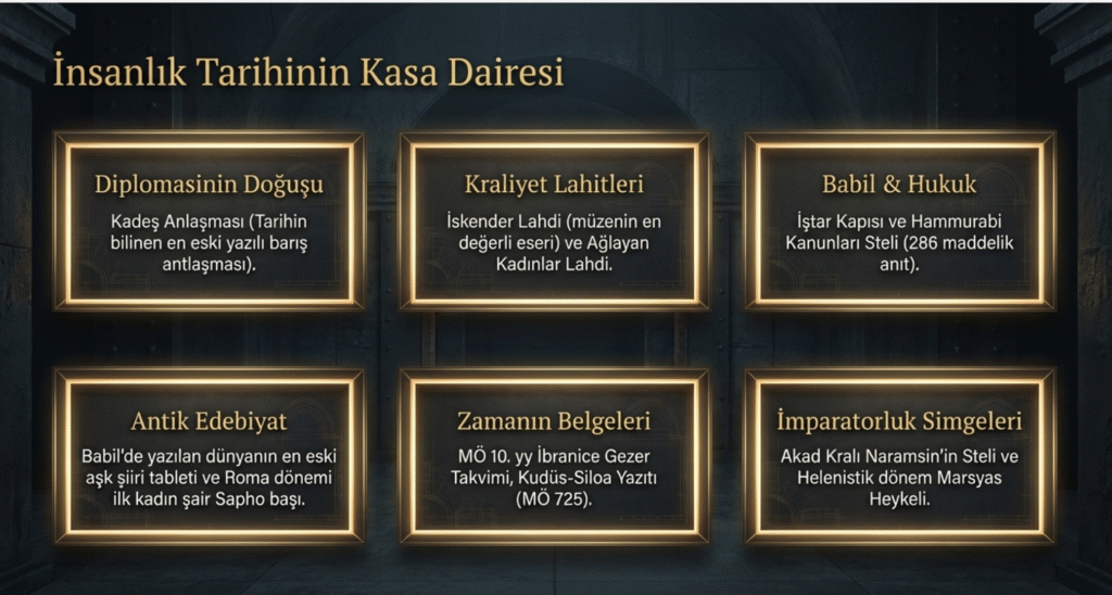 Fatih- Eski Şark Eserleri Müzesi’nde de Anadolu’daki ilk uygarlıklar, Urartu, Yunan öncesi döneme ait kalıntılar, çivi yazılı belgeler, Mısır ve Arap Yarımadasına ve İslamiyet öncesi döneme ait; adak heykelcikleri, MÖ 4- MÖ 1. yy. ait Akad Kralı Naramsi’nin Steli, Kadeş Anlaşması, İştar Kapısı ile 5.000 tane çivi yazılı tablet, güneş saati, Mısır mezar buluntularından özelikle lahitler ve kişisel eşyalar, Babil, Hammurabi Kanunu’nun 286 maddesinin yazılı olduğu stel, MÖ 18. yy. ait, Babi’de yazılan dünyanın en eski aşk şiiri yazıtı, Helenistik dönem Marsyas Heykeli, MÖ 7. yy. Roma dönemi ilk kadın şair Sapho Başı, MÖ 4. yy. Roma dönemi Tkyhe Heykeli, Miletos Faustina Hamamları Heykel Grubu, MÖ 356- MÖ 323 ait, Büyük İskender Başı, Ephebos Heykeli, Okeanos Heykeli ve müzedeki en değerli eser olarak kabul edilen Sidon’da bulunan İskender Lahdi olarak anılan Sidon Kralı Abdalonymos Lahdi, aynı yerde bulunan Ağlayan Kadınlar Lahdi, MÖ 10. yy. ait İbranice yazılmış Gezer Takvimi, Bizans dönemi, 10. yy. Simurg Kabartmaları, MÖ 725- MÖ 697 Kudüs- Siloa Yazıtı, 108 yılına ait Palmyra Mezar Odası buluntuları kronolojik sıra ile