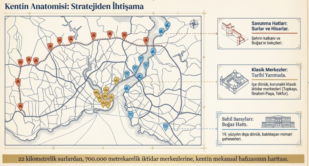 Tekfur Sarayı- Konstantin Sarayı- Porfirogennetos Evi, Fatih -Edirnekapı’da, Balat’ta, Teodosios Surları yakınında Pera, Yedikule, Prens Adaları, Kadıköy’e yayılan geniş bir coğrafyayı seyreder konumda yapılmıştır.