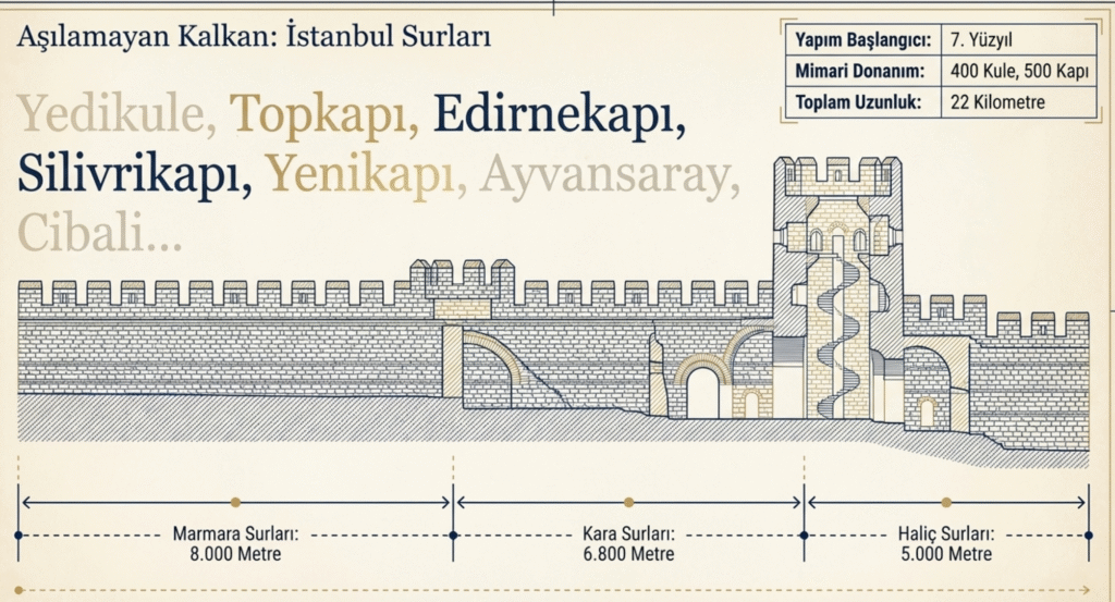 İstanbul’un tarihi yarımadayı –Sarayburnu- Haliç kıyısı-Ayvansaray- Marmara kıyısı- Yedikule- Topkapı- çevreleyen 22 km uzunluğundaki –kara 6800, Haliç 5000, Marmara 8000- surların ilk yapımına 7. yy. başlanan başlanmıştır.