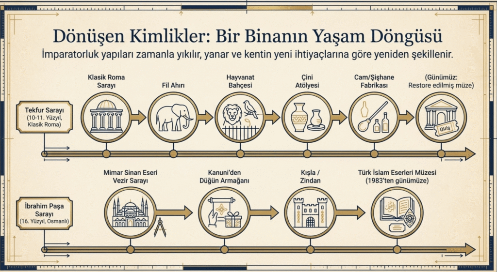 Tekfur sarayı, 1261 yılındaki Latin işgali, depremler, saldırılar sonucu yıkıldığı ve çeşitli amaçlarla- fil ahırı, hayvanat bahçesi, seramik fabrikası, çini atölyesi ve çinileri III. Ahmet çeşmesi süslemelerinde, şişhane-cam üretim yeri olarak -kullanıldığı için günümüze saraydan fazla bir parça kalmasa da 14. yy. daki onarımla iki yapı şeklinde içinde bir köşkte ilave edilerek tekrar inşa edilmiştir.