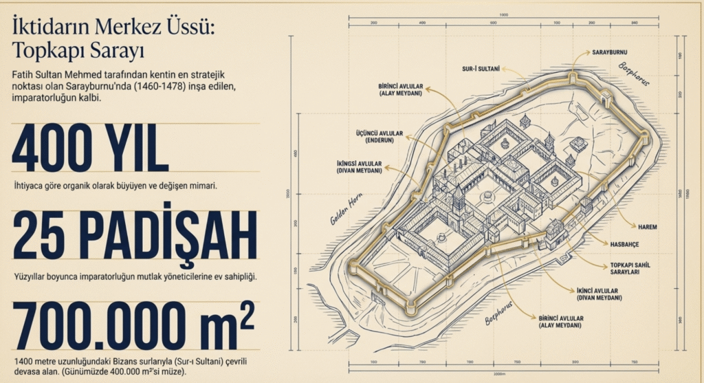 1453 yılında İstanbul’u fetheden II. Mehmet- Fatih Sultan Mehmet tarafından 1460 -1478 yılları arasında, Haliç ve Marmara Denizi’ne hâkim bir noktada, kentin en stratejik yerinde- Sarayburnu- yaptırılan Saray, Sur-ı Sultani denilen 1400 m. uzunluğundaki Bizans surlarıyla çevrilidir.