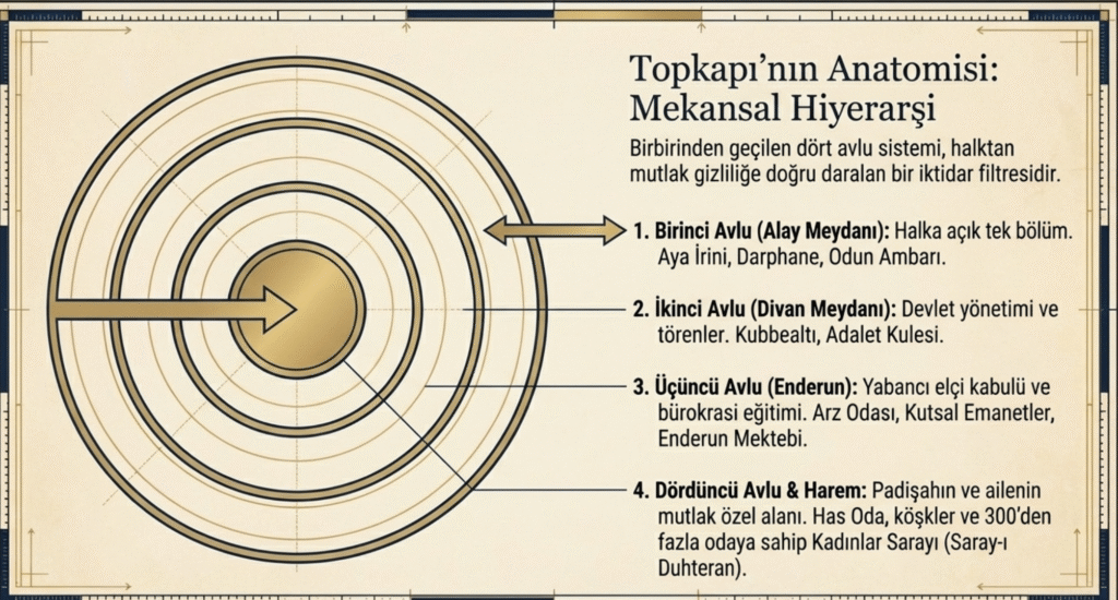 Üç önemli kapıyla– Bâb -ı Hümâyun, Orta Kapı- Bâbüsselâm ve Akağalar- Bâbüssaâde- girilen sarayın bölümlerine göre; birinci avlu- zamanında halka açık tek bölüm, ikinci avlu– devlet yönetiminin gerçekleştirildiği ve törenlerin düzenlendiği bölüm, üçüncü avlu– padişah ve hizmetindeki ak hadımlar ile saray ağalarının yaşadığı, sarayda eğitimin verildiği bölüm, dördüncü avlu– padişah ve ailesinin yaşadığı bölümdür.