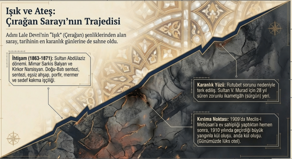 Döneminin göz doldurucu nitelikleriyle dikkat çeken Çırağan Sarayı rutubetli olduğu gerekçesiyle fazla kullanılmamış ancak 1876- 1904 yılları arasında V. Murad tarafından 28 yıl boyunca zorunlu ikametgâh- sürgün yeri olarak hizmet vermiştir.