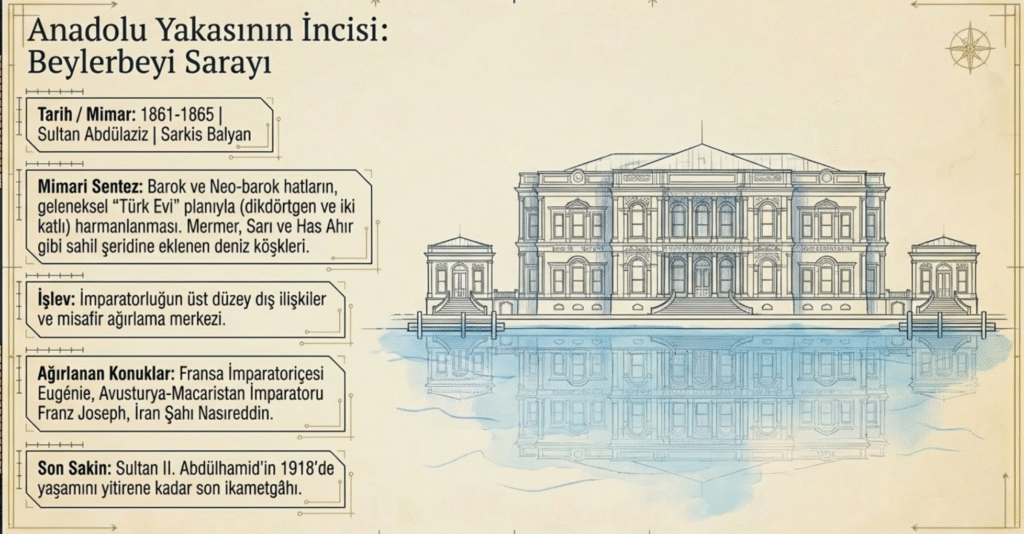 Anadolu yakası, Beylerbeyi semtinde, Boğaziçi’ne hâkim deniz kıyısındaki saray Sultan Abdülaziz tarafından 1861-1865 yıllarında Mimar Sarkis Balyan’a yaptırılmıştır.