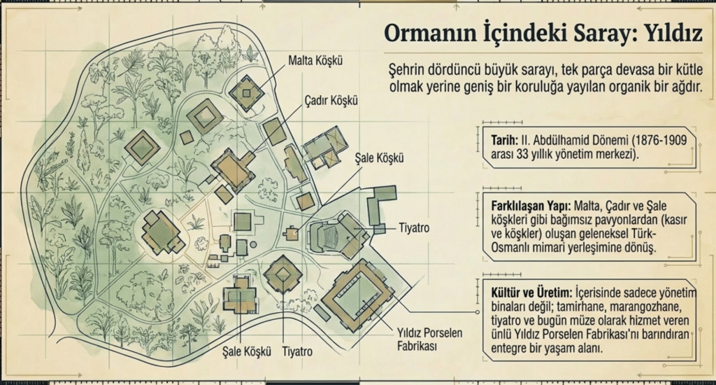 Beşiktaş- Yıldız Cami karşısındaki geniş bir korulukta çeşitli köşk, kasır ve yapıların- I. Ahmed Kasrı, Sultan Abdülaziz tarafından yaptırılan Büyük Mabeyn, Malta ve Çadır Köşkleri ile Çit Kasrı, 18. yy. III. Selim annesi Mihrişah Sultan için Yıldız Kasrı ve babası için yapılan çeşme- arasında yer alan saray, 1866 yılında Sultan Abdülaziz tarafından yaptırılan ve içinde 8 Osmanlı padişahının konakladığı kentin dördüncü –Bayezid, Topkapı, Dolmabahçe, Yıldız– sarayıdır.