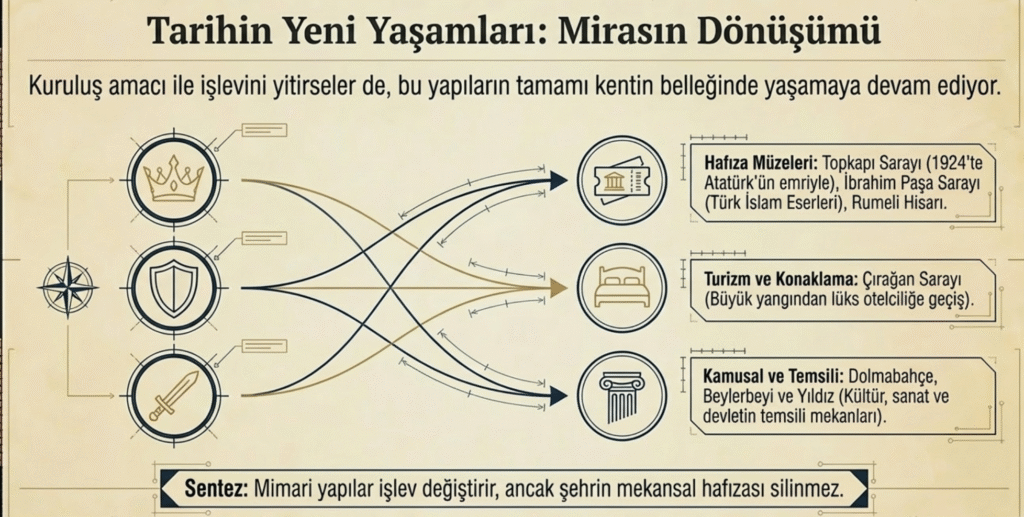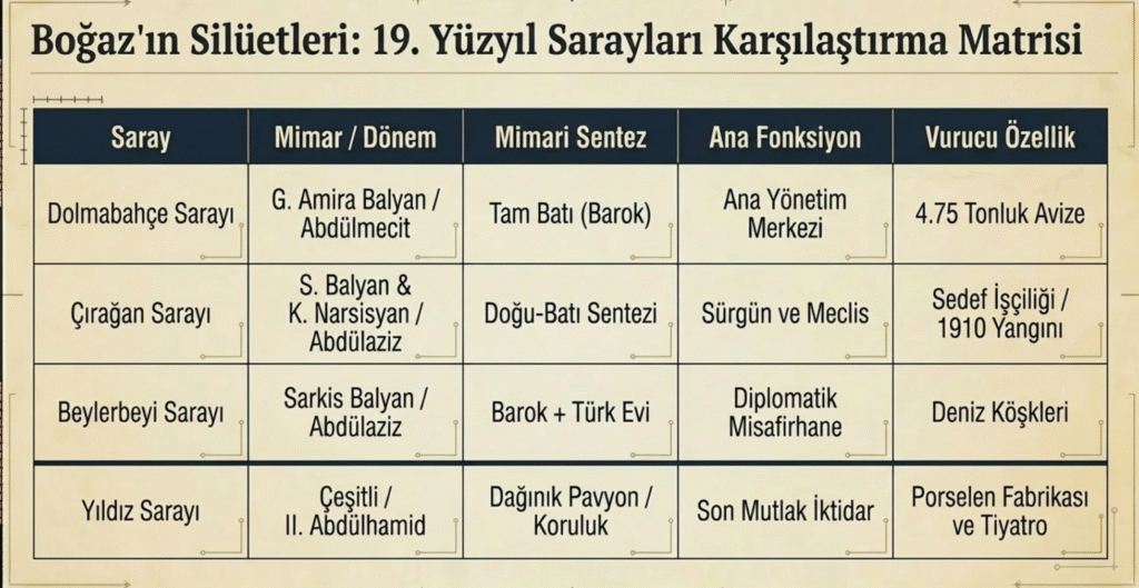İstanbul’un diğer tarihi sarayları; Ortaköy- Feriye, Fındıklı- Çifte, Kandilli- Adile Sultan sarayları da dönemlerinin mimari ve süsleme özellikleriyle son derece etkileyici yapılardır.