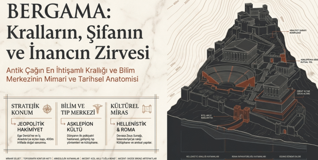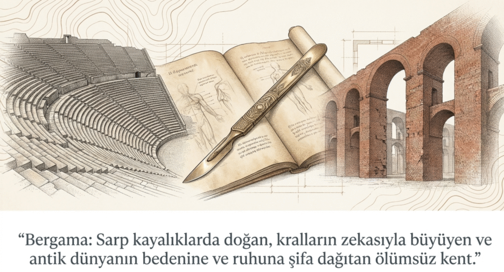 Denizden yaklaşık 400 m. yükseklikte, Bakırçay- Kaikos’un iki kolu arasında uzanan Bergama, Ege kentleri içinde konumu, antik yapıları, doğası, verimli ovası, eşsiz kalesi, yaşanmışlıkları ile bölgenin en ilgi çekici yerleşim yerlerinden biridir.