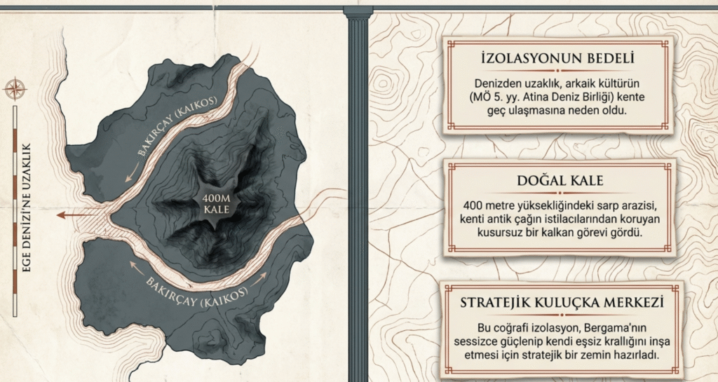 Arazisinin dik yamaçlar üzerinde yer alması, özellikle istilacılardan korunmak isteyen antik dönem uygarlıkları için en gözde yerleşim yerlerinden biri olmasını sağlasa da Bergama’nın deniz kıyısından uzaklığı bölgenin yaşadığı parlak dönemlerin –arkaik kültür, MÖ 5. yy. Atina Deniz Birliği vb.– kente ya ulaşamaması ya da geç ulaşmasına neden olmuştur.