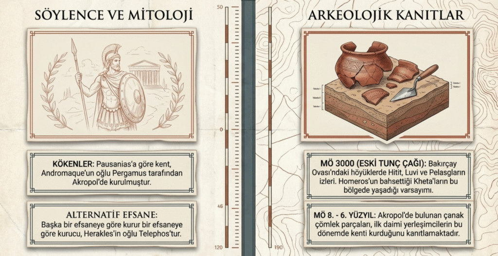 Ancak antik dönemde Pergamonos olarak adlandırılan Bergama’da yapılan arkeolojik kazılarda ele geçirilen çanak çömlek parçaları kentin ilk daimi yerleşimcilerinin MÖ 8. MÖ 7. ve MÖ 6.yy. da olduğunu belirtmektedir.