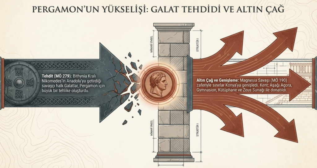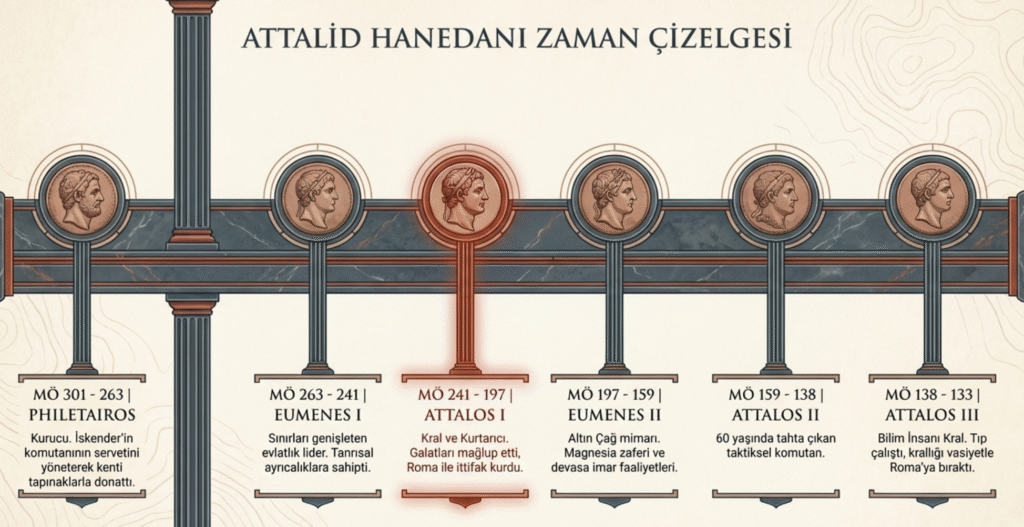 Eumenes’in ardından kentin yönetimi MÖ 241- MÖ 197’de evlatlığı Attalos’a geçer. Yönetimi süresince yaklaşık kırk dört yıl mücadele ve çarpışmalarla uğraşan Attalos’un en ünlü zaferi, MÖ 230 Galatlara verdiği savaştır. Bithyania Kralı, Nikomedes tarafından MÖ 279 yılında Orta Avrupa’dan Anadolu’ya getirtilen savaşçı halk Galatlar zamanla diğer Anadolu halkları gibi Bergama için de tehlike oluşturmuşlar ve haraçla yaşayamaya çalışmışlardır. Ancak I. Attalos tarafından yenilerek Pergamon ve bölgeden kovulmuşlardır. Galatları Batı Anadolu’dan atan I. Attalos da Kral ve Kurtarıcı ünvanını almıştır.