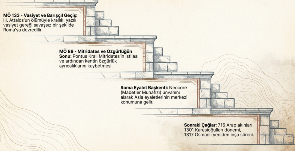 Roma egemenliğini istemeyen ardıllar ve Pergamonlular olsa da bir süre sonra kent Roma’nın Asia eyaletleri- Mysia, Ldyia, İonia, Karia- arasında yerini aldı. Asia eyaletleri başkenti konumunda olan kente Neocore- Mabetler Muhafızı denilmiştir.