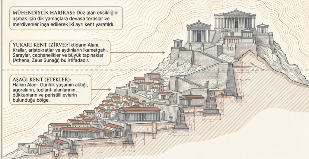 Bergama’nın ilk sakinleri de bu durumu dikkate alarak Akropol’de tüm ovaya hâkim, yüksek bir tepe üzerine düz alanları teraslarla genişleterek merdivenlerle bağlı iki kent –Yukarı ve Aşağı Kent- kurmuşlar.