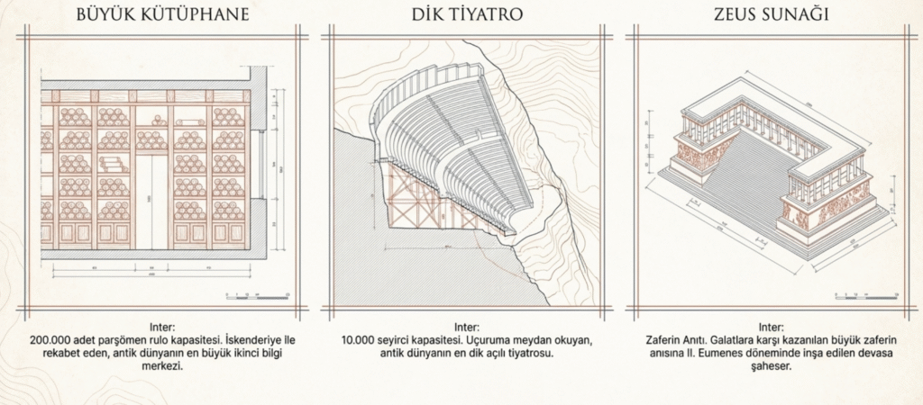 Özellikle II. Eumenes zamanında en geniş haline kavuşan surlar ile yelpaze şeklinde büyüyen kente pek çok yeni yapı- Galatları yenmenin anısına yapılan Zeus Sunağı, Athena Tapınağı Proplonu ve stao, Büyük Saray, Kent Surları, 200 bin kitaplık Kütüphane, 10 bin seyirci kapasiteli dik yamaca yapılan Tiyatro- inşa edilmiştir.