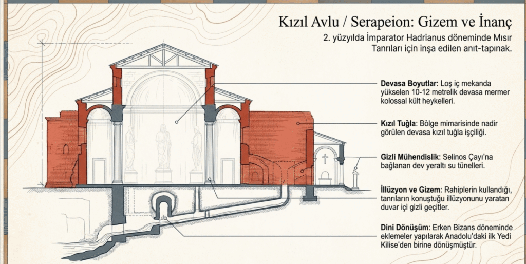 Halen kentin en ilgi çeken yapılarından olan Kızıl Avlu- Serapeion Anıt- Tapınak’ tan Selinos Çayı’na ulaşmak için su tünellerinin kazıldığı da bilinmektedir.