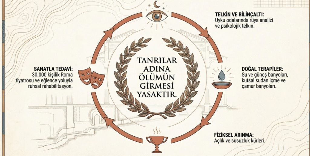 Girişinde “Tanrılar adına ölümün girmesi yasaktır.” diye yazılı MÖ 4. yy. ’ın ilk yarısında inşa edilen Asklepion ile Tapınak, Eskiçağ’daki Epidaurus ve Kostakiler kadar önemli ve büyük bir sağlık merkeziydi.