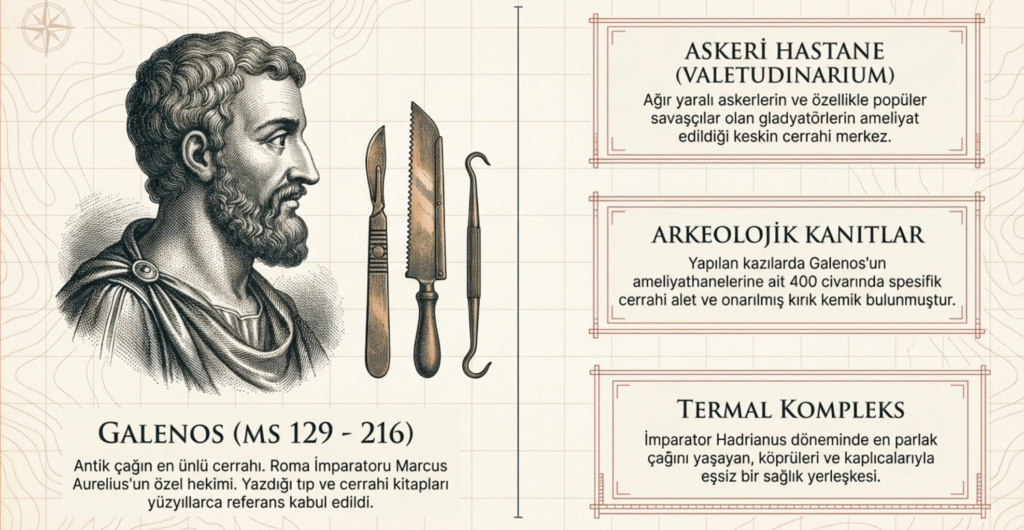 Bir dönem İmparator Marcus Aurelius’un özel hekimliğini de yapan Galenos’un yazdığı tıp ve cerrahi kitapları uzun yıllar tıp camiası tarafından kullanılmıştır.