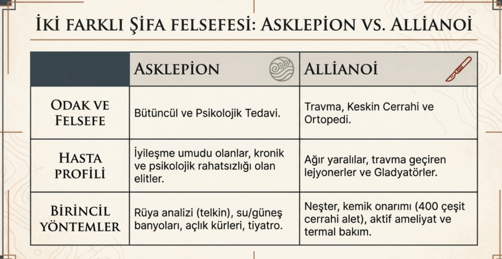 Bergama’da yer alan ünlü sağlık merkezi Asklepion’a genellikle iyileşecek hastalar alınırken bir çeşit askeri hastane- valetudinarium olarak kullanılan Allianoi’ ya ağır yaralılar, başta gladyatörler- dönemin kahraman ve popüler savaşçıları– ameliyatlar için alınırmış.